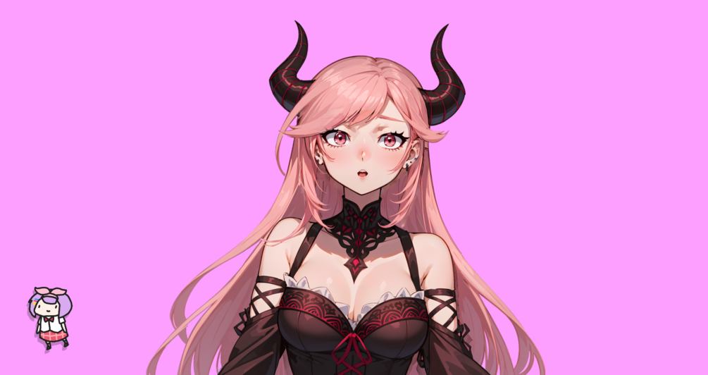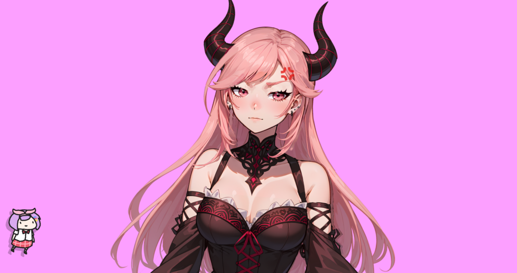 Unveiling a captivating Vtuber model: an enchanting demon with lustrous pink hair, adorned with bewitching black horns and a matching tail. Her attire is a blend of elegance and allure, featuring a corseted dress with delicate lace and rose accents. Perfect for digital streaming and content creation, this model promises to add a touch of mythical charm and personality to any virtual space. Ideal for creators seeking to bewitch and engage their audience.